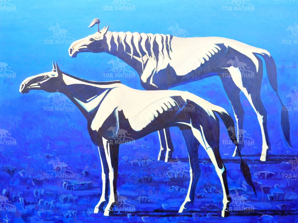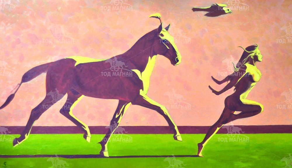 Бүтээл төрөх агшин. Хаа нэгтээ юм аа гээсэн эсвэл мартсан хүн шиг эрж хайж явах бөгөөд “олбол” цаасан дээр бичнэ. Үгүй бол утсан дээрээ рекорд хийнэ. Ингэхдээ тийм өнгөтэй, эндээсээ ийм хөдөлгөөнтэй, иймэрхүү донж хөдөлгөөнийг илүү гаргасан байна гэхчилэн нарийвчилна. Хамгийн сүүлд энэ мэт гоё мэдрэмжээр төрсөн бүтээл бол “Амар амгалан”. Тэр морины нуруун дээр тухтай атлаа амар амгалан унтаж буй жаалхүү бол түүний том хүү гэдэг. Энэ зурагт хурд хүчний бэлгэдэл адууны энерги энэ ертөнцийн хамгийн цагаахан нөхдийн нэг хүүгийн амар амгалантай хослоно. Зураачийн хувьд энэ бол түүний хайртай бүтээлүүдийн нэг. Энэчлэн санаа бол эргэн тойронд дүүрэн ч түүнийг аль өнцгөөс харж мэдэрч, тэгээд бас уран бүтээлээрээ дамжуулан гаргана гэдэг амаргүй гэнэ. Тэгээд цааш нь “Уран бүтээлчийг юм хийхэд хамгийн их садаа болдог зүйл бол шинжлэх ухаан. Энэ бол хүнийг болон байгалийг хамгийн их эвддэг зүйл. Том соёлыг ч үгүй хийдэг. Тийм учраас шинжлэх ухаанд их итгээд ирвэл бүх юмыг үгүй хийж эхлэх учраас итгэхээр зүйл бас биш” тухай ярьсан юм. Түүний морьд цэнхэр, ногоон бүүр чернилэн ягаан өнгөтэй. Морьдын хамтаар нүцгэн бүсгүй, нялх хүүхэд, дурлалт хос, дураар дүүлэн нисэх шувууг оруулсан байх нь “этгээд” мэт санагдах ч удаанаар харах тусам төгсгөлгүй мэт сонирхол татна.