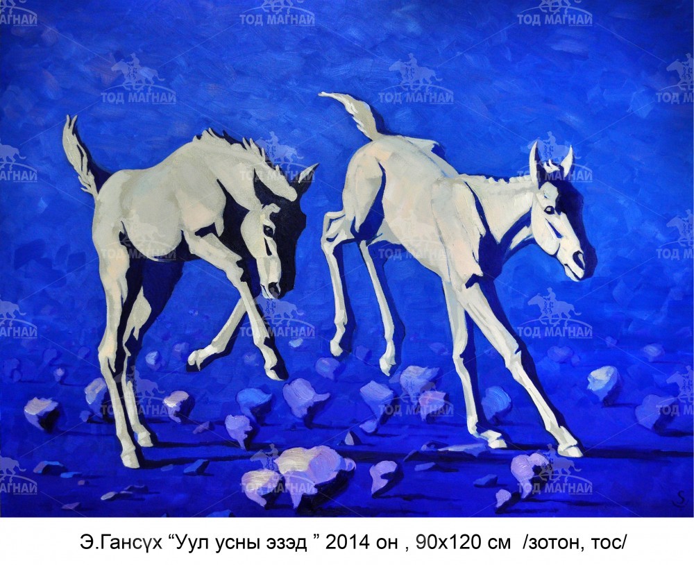1989 онд хэвлэгдсэн Лувсанбалдан гуайн “Хүлгийн шинж” номыг Тойныжав ахынхаа гэрийн унинд хавчуулсан байхыг олж уншжээ. Эндээс их олон зүйлийн тухай олж мэдсэн бөгөөд 2000 оноос судалгааны ажил болгож эхлүүлжээ. Өөрөөр хэлбэл Дүрслэх урлагийн сургуулийн оюутан Э.Гансүх хурдан морины соёлын судалгаан дээр ажиллаж эхлэв. Өнөө багын моринд хорхойтой сэтгэл ийнхүү өдөр ирэх тусам хүрээгээ тэлж өргөжсөөр байгаа нь тэр л дээ. Энэ хугацаанд өөр өөрийн морьдыг хэдэн янзаар нь “уяж сойно”. Ингэхдээ голдуу харж цаасан дээр буулгах ч хурдыг нь гүйцэхгүй тул санаанд нэг л үл хүрнэ. Харин хурдан морь бол өөр. Уяатай удаан гэгч нь зогсох учраас тааваараа зурж сая нэг дуусна. Энэчлэн зурагт амилуулах тусам илүү амташна. Тэр үеийн бүтээлүүдийн нэг болох “Жаргалын найман морь” гэхэд өдгөө эдний ах дүүсийн гэрийн хойморыг чимсээр л байдаг гэнэ. Ингэж адуу түүний уран бүтээлийн салшгүй нэг хэсэг болох нь тэр. Эхэндээ харж зурдаг байснаас 2012, 2013 оноос төсөөллөөрөө бүтээх болжээ. Энэ тухайгаа “Реалистаар зурсаар сүүлдээ кайф авахаа больсон” гэж ярих аж. Хэдийгээр тухайн үедээ адил болж байгаа ч ахиад л уран бүтээлчийн шунал өөр тийш нь уруу татаад санаа амраасангүй. Үүнээс өмнө “Нутгийн захад” гэдэг нэртэй зургийг зурсан нь түүний сүүлийн реалист зураг болж таарсан аж. /Зургийн “гол дүр” Тод манлай уяач Давгадоржийн Согоо хээр морь юм/. Морио зурчихлаа гэхэд тохирсон байгаль нь олдохгүй. Нэг бол үүл нь гологдоод үгүй бол нэгдүгээр планы өвс санаанд таарахгүй гээд “өөрийгөө зовооно”. Гэтэл нэг өдөр эмээ “Хөрзөн хуулаадах” гэж гаргалаа. Тэгж явахдаа өвөлжөөний нь наад талын энгэрийн ногоо өөрийн эрхгүй нүдэнд туслаа. Фотог нь дарж авчихаад дараа нь өнөө зургаа амилуулснаар жил тойрсон бүтээл төрсөн түүхтэй аж. Энэ зураг 2012, 2013 онуудад хоёр ч зургийн тэмцээнд орж, түрүүлсэн байдаг юм билээ. Үүний дараа Тод манлай Согоо хээрийнхээ уг зургийг япон машины ханшаар худалдаж авсан байдаг юм.