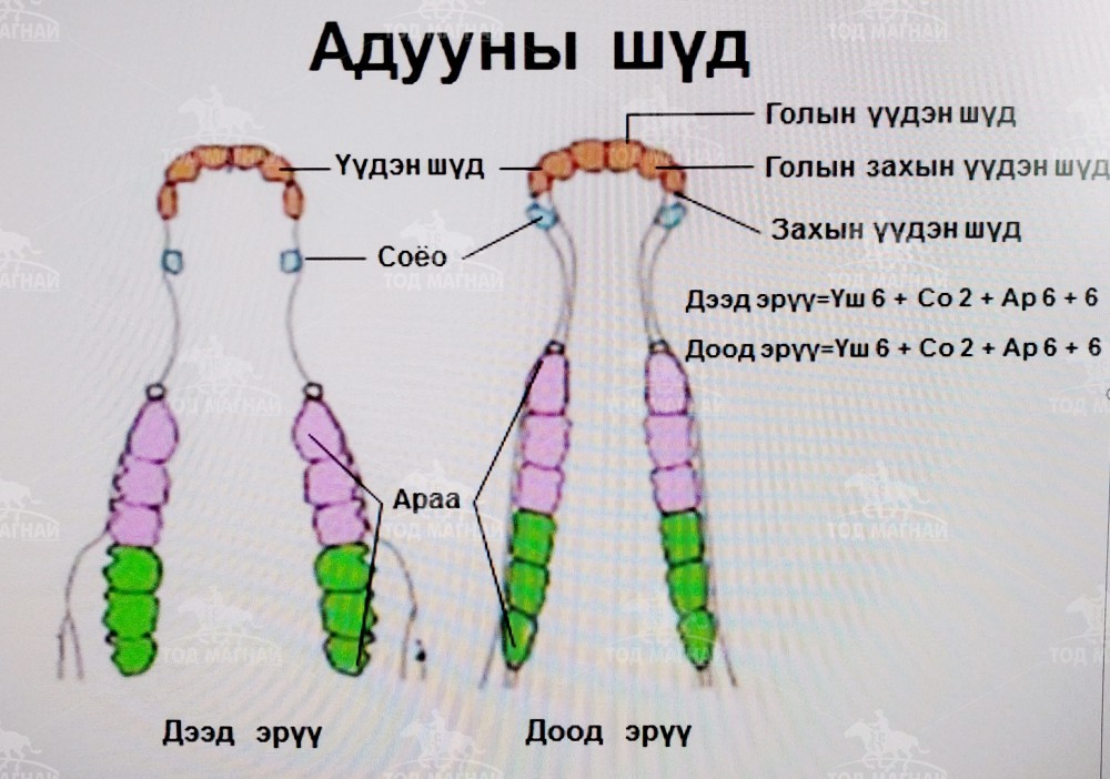 Хэвлэлийн тоймоос үзэхэд бэлчээрийн маллагаатай манай орны нөхцөлд адуу ихэнхдээ сүүн шүд элэгдэн унаж, байнгын ясан шүдээр солигдож шинээр шүд цухуйх үйл явц хуанлийн 11-12 сард эхэлж хавирах ирмэг гадаргуу нь 5-6 сард түрж урган тэгширч ирдэг тухай тэмдэглэн үлдээсэн байдаг. Зуны дунд сар буюу 7-8 сард болж байгаа наадмын үед шүд үндсэндээ солигдож ургаж гүйцсэн байдаг бөгөөд миний энэхүү бүтээлд үзүүлж байгаа шүдний ургалтын байдал нь шүд бүрэн солигдож дууссан 7-р сарын үед авсан фото зураг ашигласан болно.