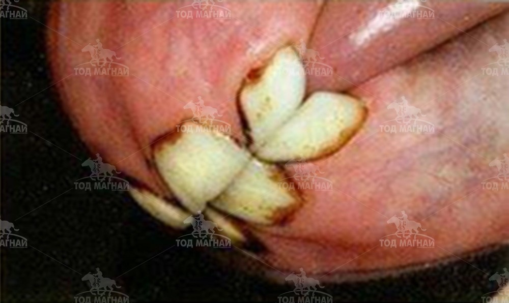 Шүдлэн буюу хоёр настай адууны үүдэн шүдийг хажуу талаас нь харуулсан байдал
